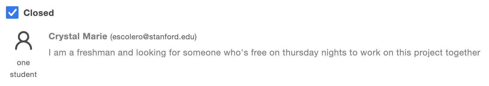 When the teammate search is complete, the student who created the post can mark the search as “Done. Marked as closed.”