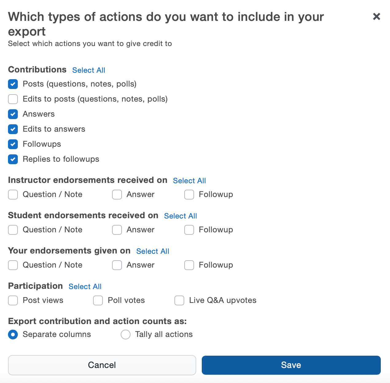 Select the checkboxes for the kinds of contributions (i.e. student actions) you would like to include in your export.
