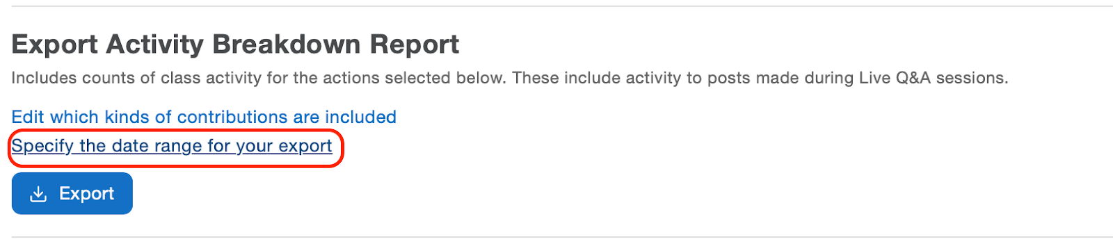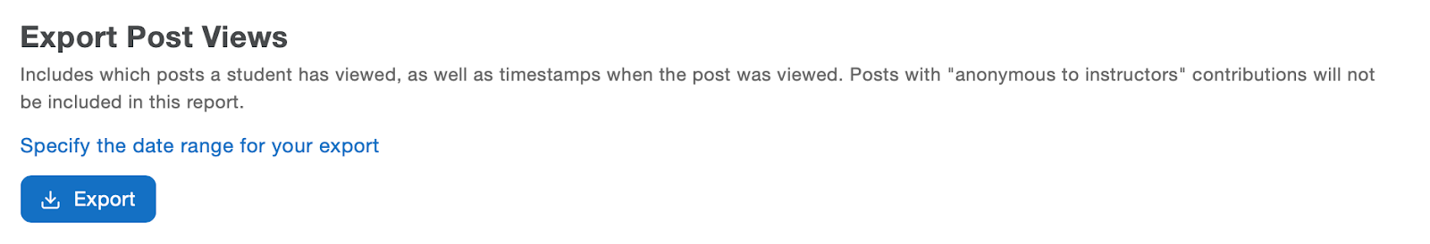 For certain content categories, you can use ‘Specify the date range for your export’ to take a closer look at student participation during a specific window of time: