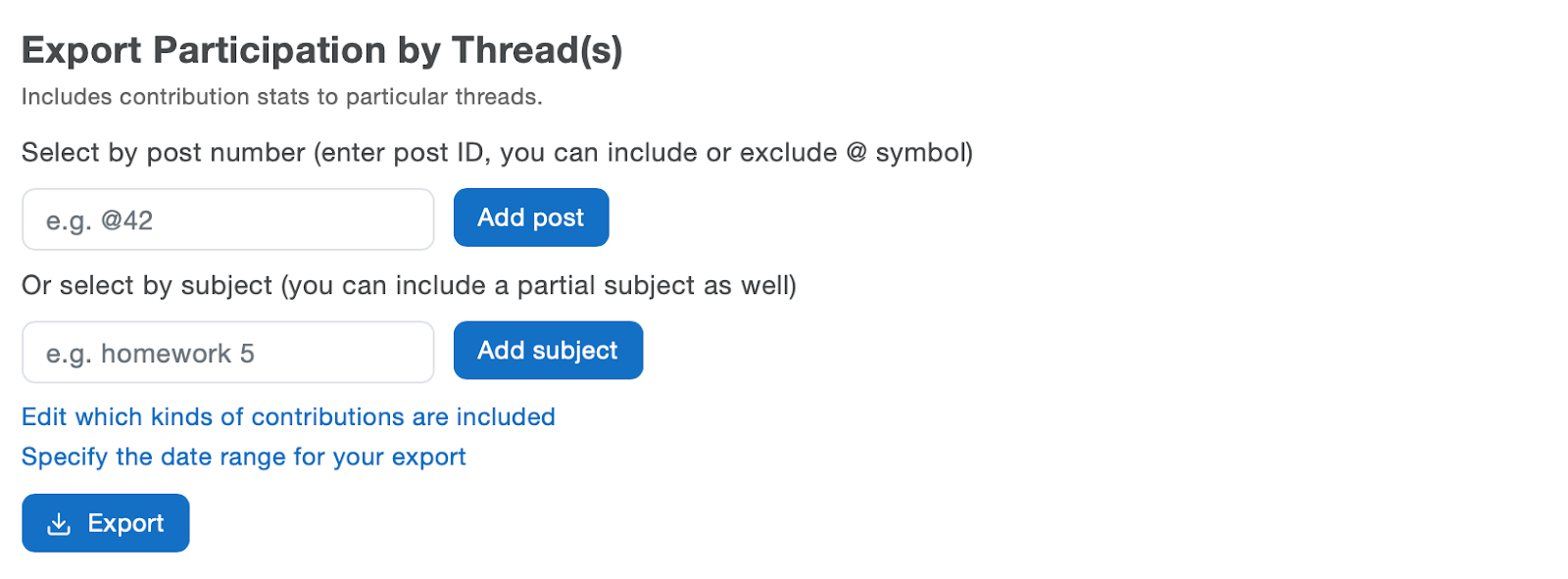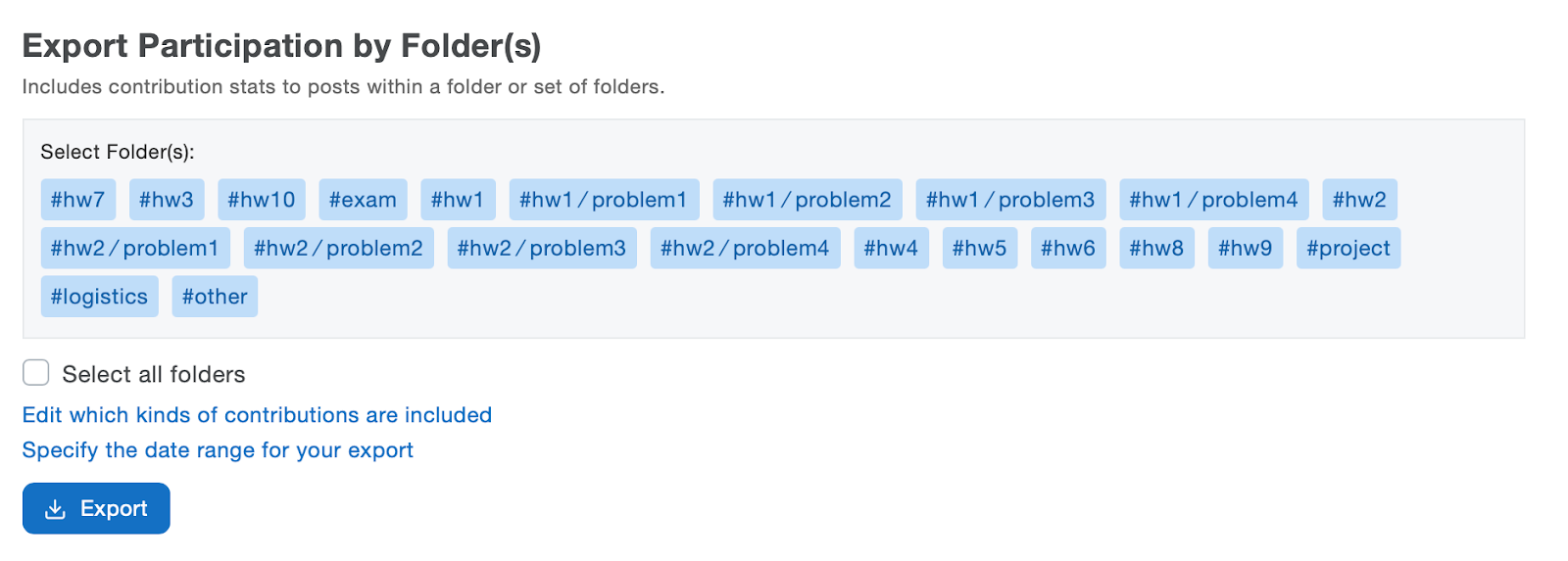 The Export Statistics tool allows you to customize and monitor counts of class activity such as post views, participation by folder(s), thread(s), Live Q&A, and poll statistics.