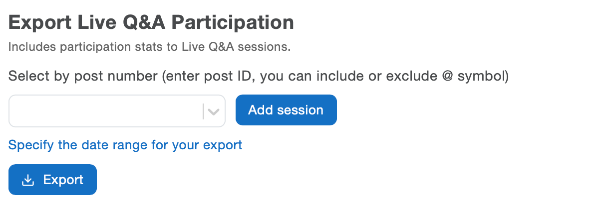 This export includes contribution statistics for Live Q&A sessions, with the option to include upvotes.